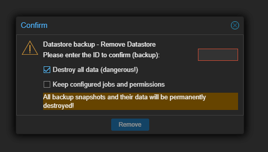 もうバックアップ消しちゃったし、データストアを消したところで大差はありません。Proxmox Backup Serverから、データストアをまず消しました。たしかKeep configured jobs and permissionsにはチェック付けなかった気がするけど、記憶が定かではありません。